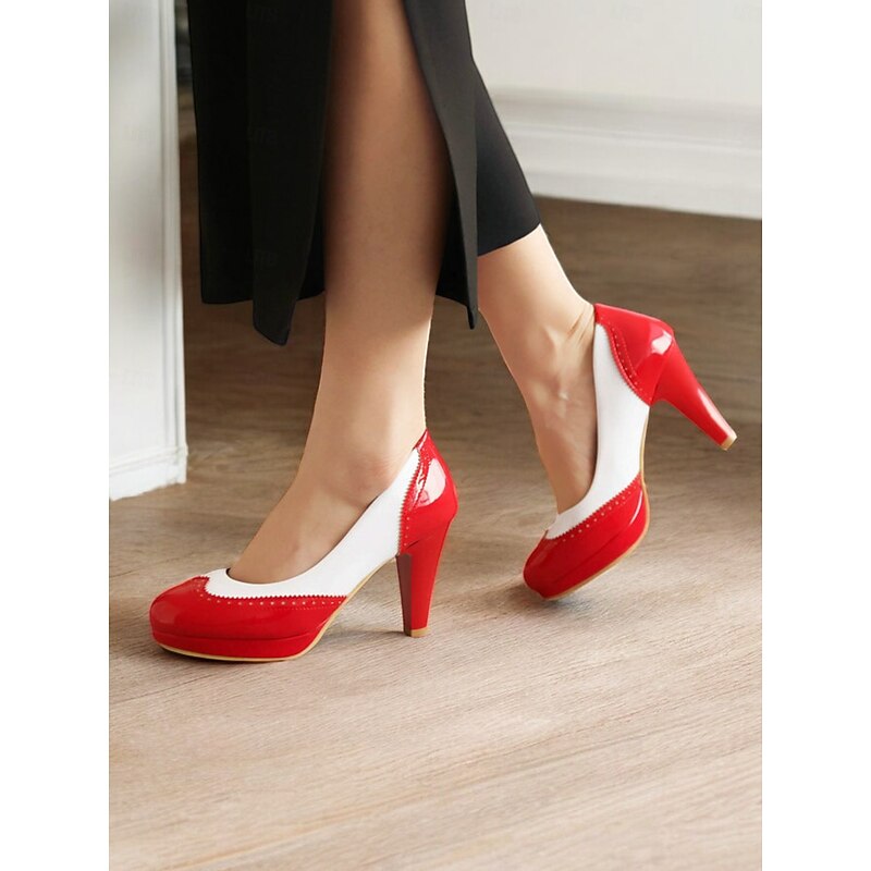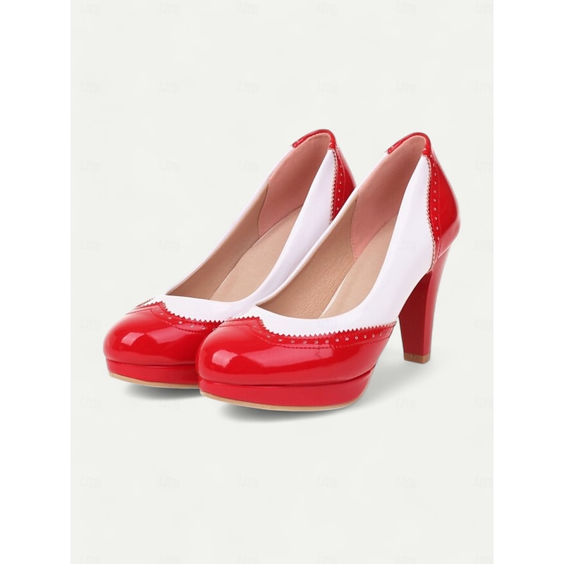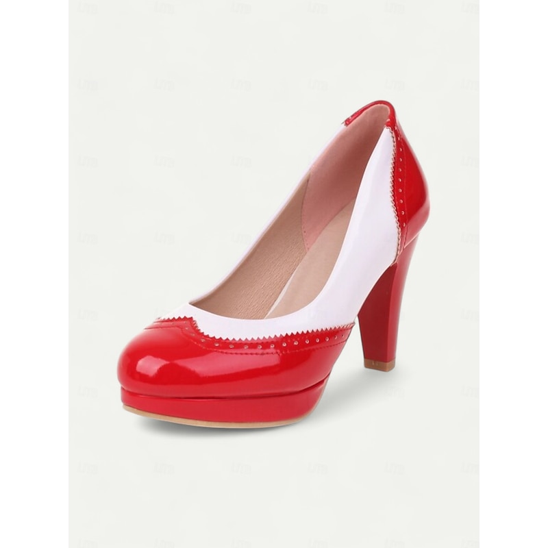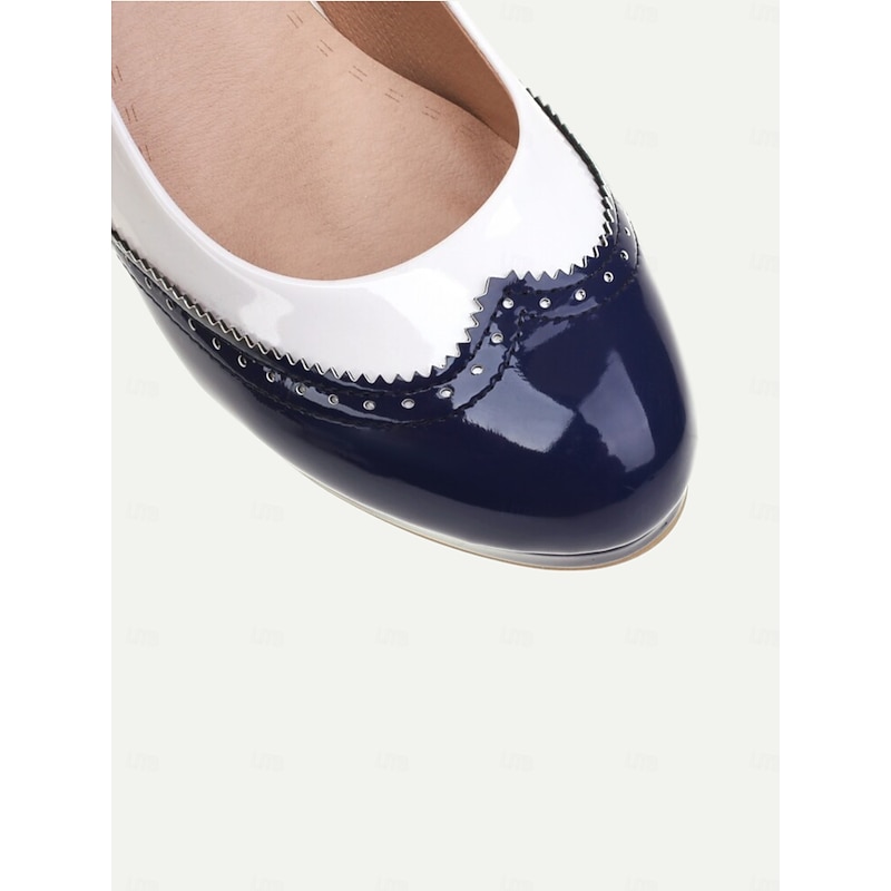 Highlights [Material] : Crafted from high-quality PU for the upper, these pumps offer a sleek and polished finish akin to faux patent leather. The lining is made from synthetic leather, ensuring durability and comfort for extended wear. The outsole is robust rubber, providing reliable traction. [Silhouette] : Featuring a round toe and a chic cone heel with a slight platform, these pumps combine height with comfort and ease of wear. The moderate heel offers a flattering boost to your height while maintaining stability. [Design Highlights] : These vintage-style pumps boast an elegant two-tone color block in classic black and white, accentuated by sophisticated brogue detailing along the edges. The contrasting cap-toe design adds a refined touch, enhancing the shoes' timeless appeal. [Occasions] : Perfect for a range of events including parties, everyday wear, and professional settings. The versatile black and white scheme makes them ideal for both formal attire and smart-casual outfits, ensuring you step out in style on any occasion. [Size Range] : Available in a wide range of sizes, from US5.5 / EU35 / UK3.5 to US10.5 / EU42 / UK8.5, allowing you to select your usual size for the best fit. The standard sizing ensures these pumps cater to a variety of foot sizes.