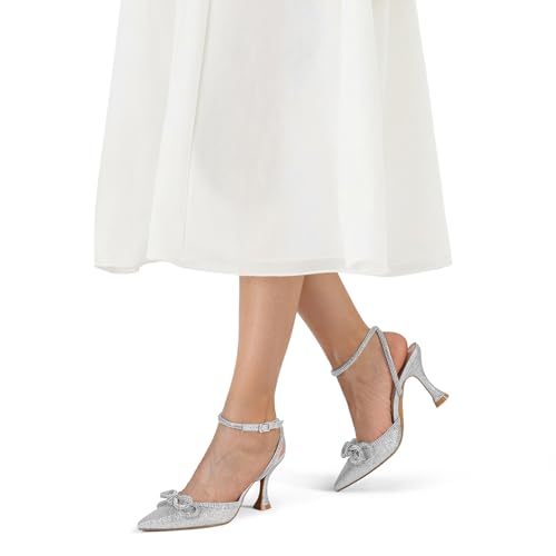mysoft Women's Rhinestone Bow Pumps Wedding Dress Shoes Pointed Toe Ankle Strap Kitten Heels 1