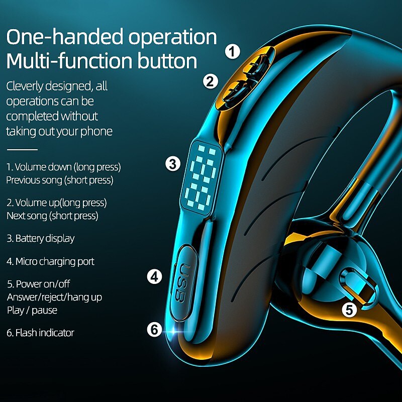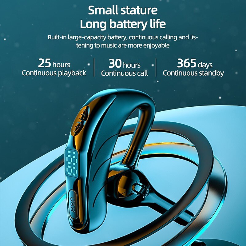 Highlights 360 Degrees Rotating Design for Both Left and Right Ear Comfort Uses Bluetooth V5.2 Chip for Stable Signal Transmission Bluetooth Transmission Distance of up to 10 Meters A Creative Hook Design with Only 15g Weight Ensures Stability and Comfort Supports Volume Adjustment and Music Change 80/160mAh Battery Capacity for Extended Use Features CVC 8.0 Noise Reduction Technology Working Voltage of 3.7V and Charging Voltage of DC5V Charging Time of about 1-2 Hours and 30 Hours of Talking Time Enjoy Music for up to 25 Hours Frequency Response of 20 - 22kHz Includes Bluetooth Headset, Charging Cable, User Manual, and 2 Ear Caps.