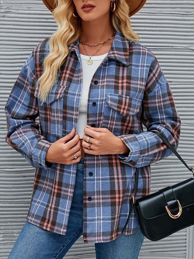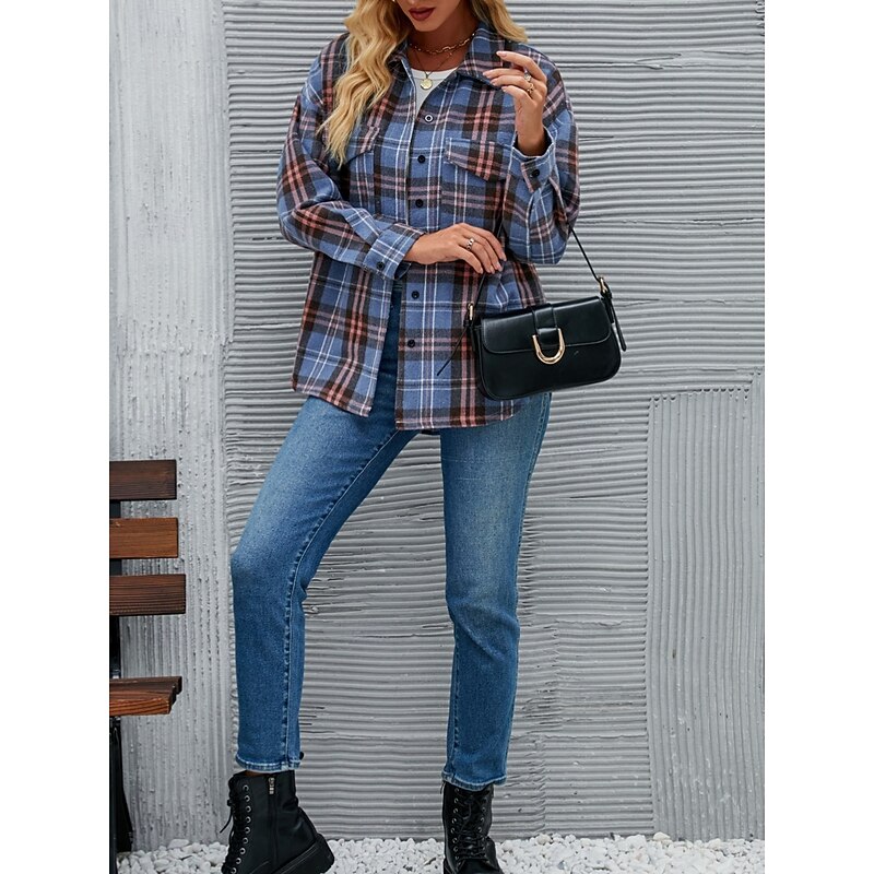 More information about Women's Shirt Jacket Casual Jacket Comfortable Breathable Pocket Buttons Print Fashion Casual Plaid Vacation Street Casual Daily Wear Single Breasted Regular Stand Collar Regular Fit Long Sleeve