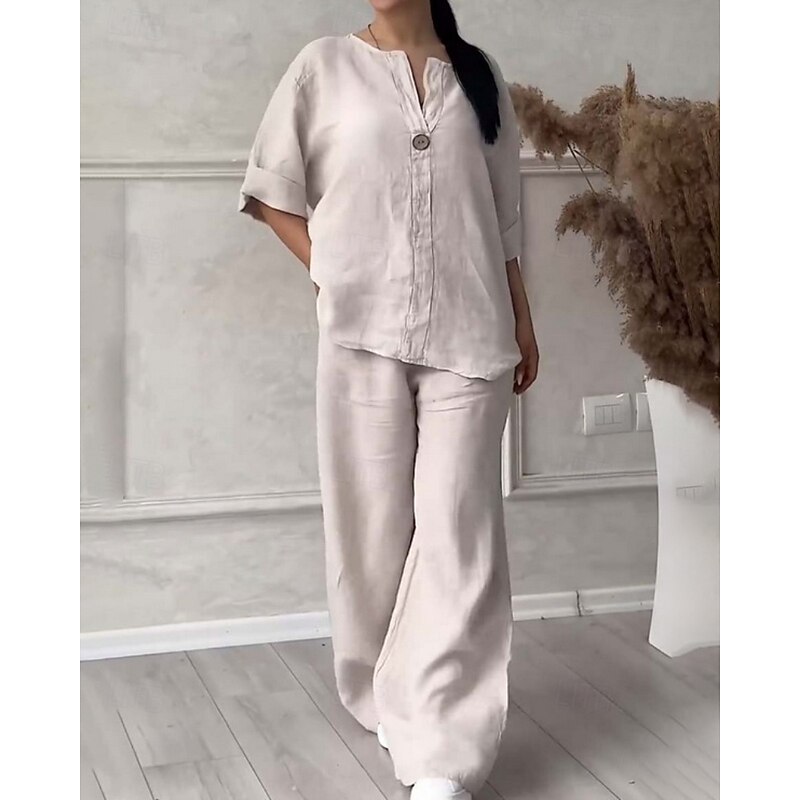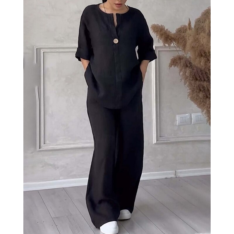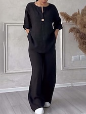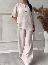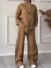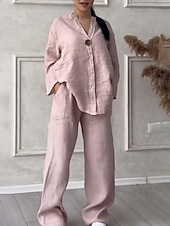 More information about Women's Active Fashion Cotton Linen Shirts Blouse Pants Sets Long Sleeve V Neck Solid Color Outdoor Weekend Black White Pink Summer Regular Fit