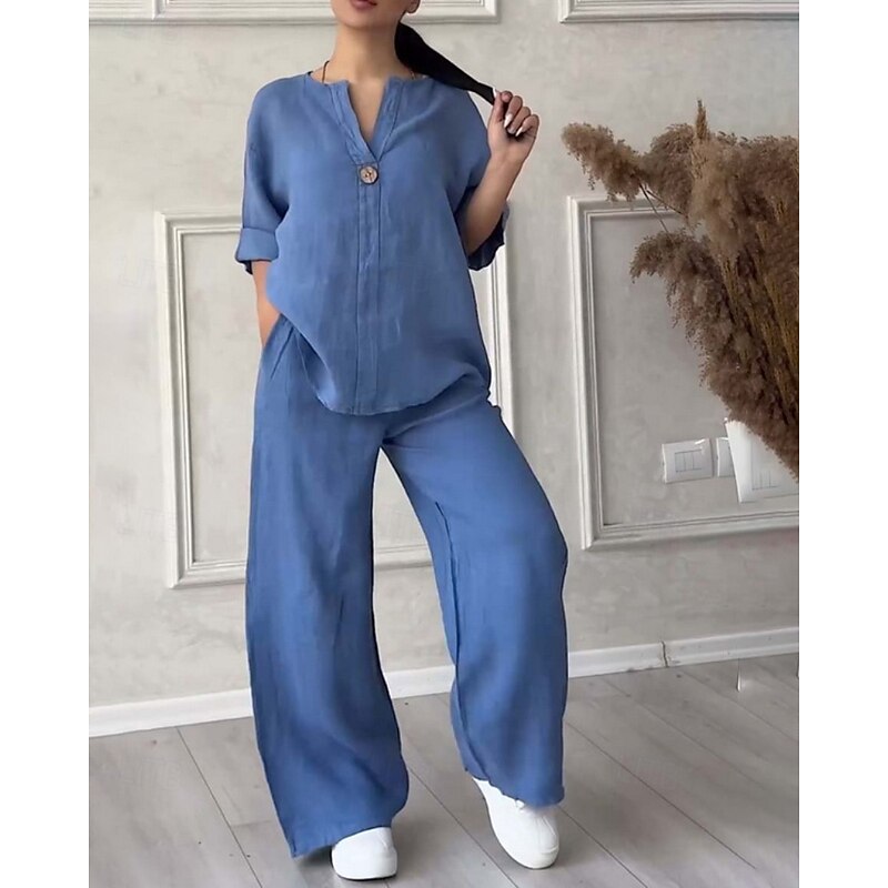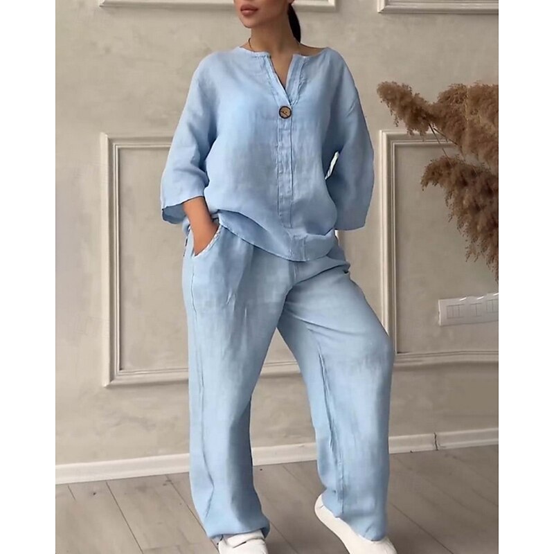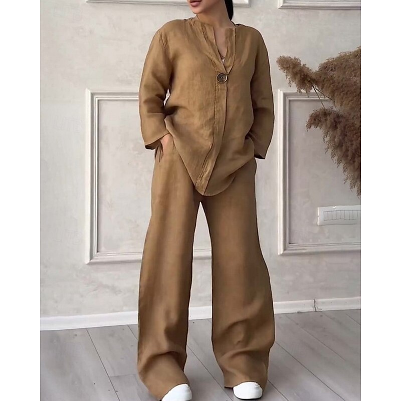 HOT ! Women's Active Fashion Cotton Linen Shirts Blouse Pants Sets Long Sleeve V Neck Solid Color Outdoor Weekend Black White Pink Summer Regular Fit