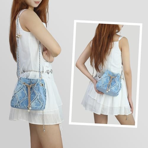 • Structure: The main bag of this denim bag is closed with a drawstring. Its cylindrical design has a large internal capacity, which is suitable for carrying a large number of small items.The adjustable & detachable 48 in chain strap allows for versatile wear as either a shoulder bag, crossbody bag, handbag.