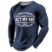 Highlights [Fabric] : Crafted from a high-quality polyester fabric, this men's long-sleeve t-shirt provides a soft feel and micro-elastic flexibility. The breathable material ensures comfort in any casual setting, making it suitable for daily wear throughout spring, summer, and fall seasons. [Fit] : Designed in a regular fit, this t-shirt features a classic crew neck and long sleeves, offering a timeless and versatile style. The form-fitting design allows for ease of movement and ensures a flattering silhouette, perfect for both street and casual occasions. [Design Highlights] : Stand out with the 3D printed funny slang graphic on the front, which reads, "I don't know how to act my age. I've never been this old before." The vibrant design is enhanced by the dark base color, making it an eye-catching and humorous addition to your wardrobe. The trendy designer and retro vintage elements add a unique touch to your everyday look. [Occasions] : Perfect for streetwear, daily outings, and casual gatherings, this t-shirt seamlessly blends humor with style. It's ideal for those seeking to express their personality and add a light-hearted touch to their ensemble, whether for a casual day out or lounging at home. [Size] : Available in a wide range of sizes from S to XXXL, this t-shirt caters to adults looking for comfortable and stylish apparel, with options to suit various body types and style preferences.