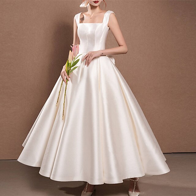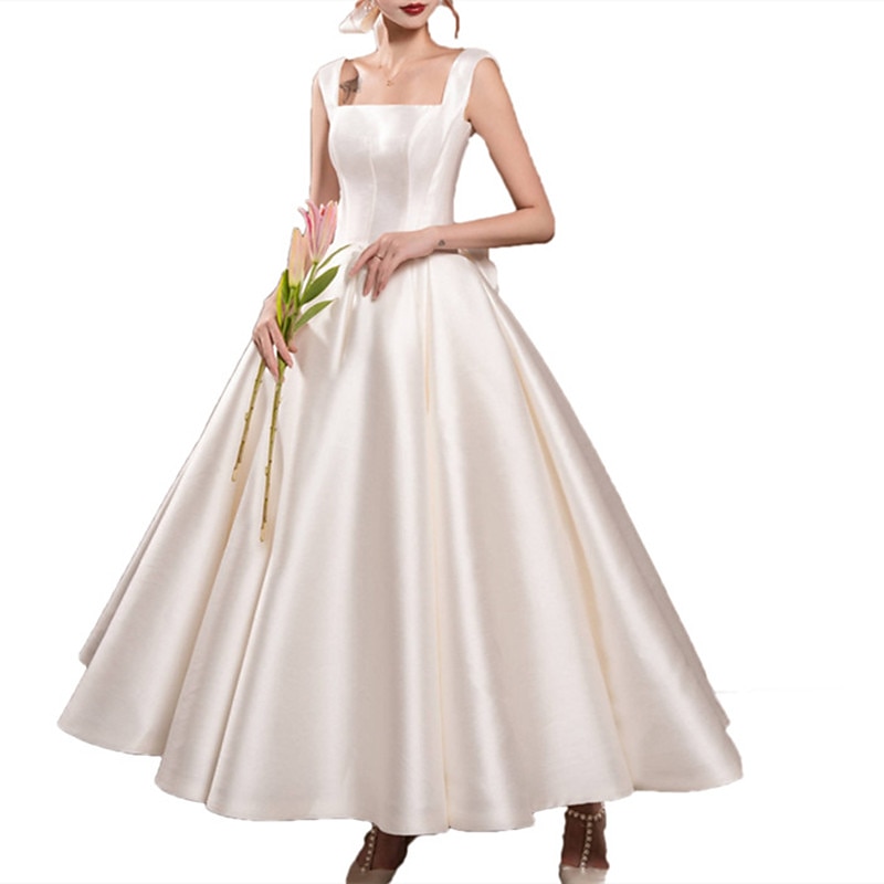 More information about Reception Simple Wedding Dresses Wedding Dresses A-Line Off Shoulder Cap Sleeve Tea Length Satin Bridal Gowns With Pleats Ruched dress to impress Fall Wedding