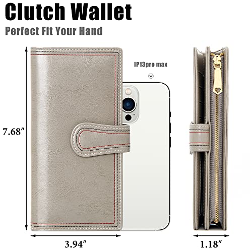 CILLA Womens Leather Wallet Large Capacity Bifold Ladies Zipper Clutch Credit Card Holder With Coin Pouch Oil Wax Design(Grey) 5