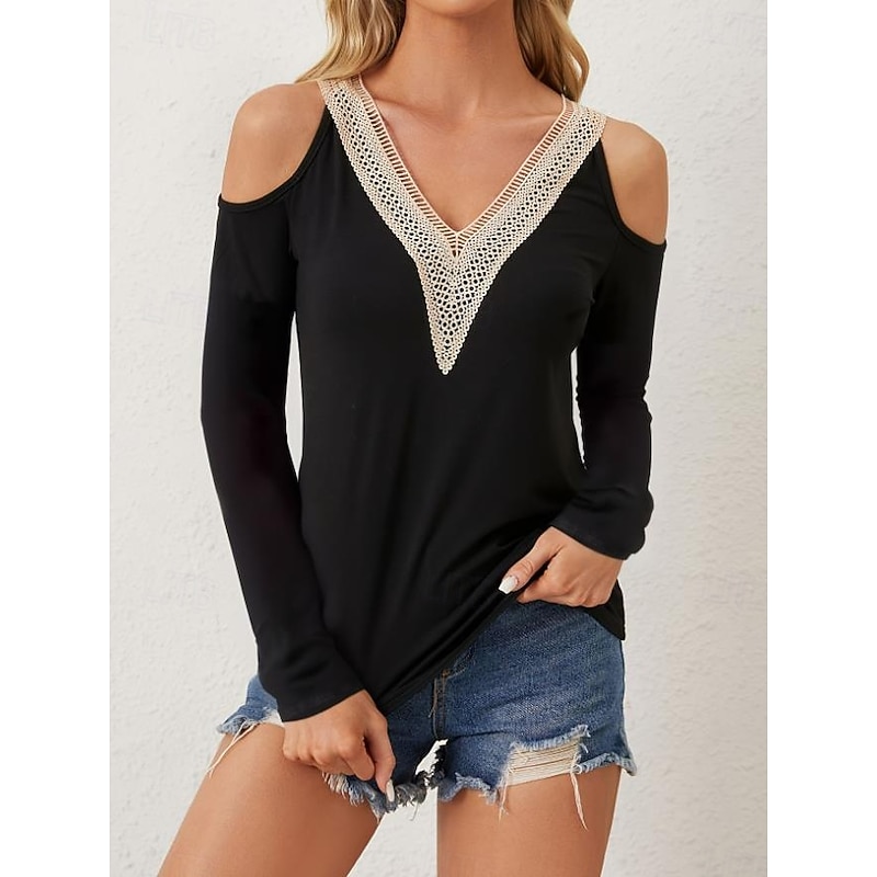 Highlights [Fabric and Fit] Crafted from a soft, micro-elastic polyester fabric, this women's blouse provides a comfortable form fit that complements your figure. The fabric’s stretch ensures ease of movement, making it an excellent choice for daily wear. [Design Highlights] Featuring a chic cold shoulder design with a stylish V-neckline, this blouse is adorned with intricate crochet lace detailing that adds a touch of elegance. The patchwork details give it a modern and trendy look, perfect for enhancing any outfit. [Occasions] Ideal for daily wear or the workplace, this blouse effortlessly transitions from casual settings to more formal events. Pair it with jeans for a relaxed day out or with a skirt for a sophisticated office look. [Size Range] Available in sizes S, M, L, XL, and 2XL, this blouse offers a wide range of options to suit different body types and preferences. [Care Instructions] Designed for easy maintenance, this blouse is machine washable, making it convenient for regular use.