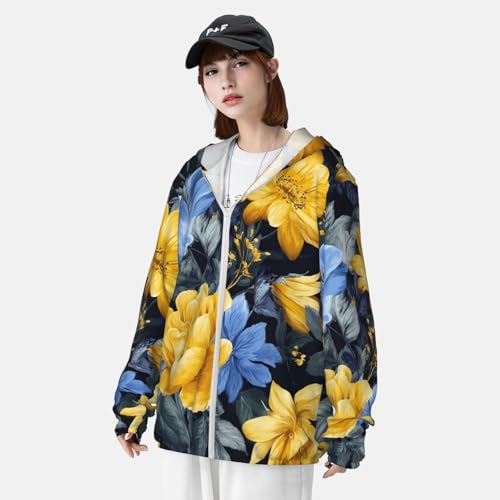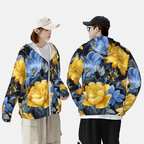 Sun Protection Hoodie Shirt Blue Base Yellow Floral UPF 50+ Long Sleeve Outdoor Rash Guard for Men Women 1