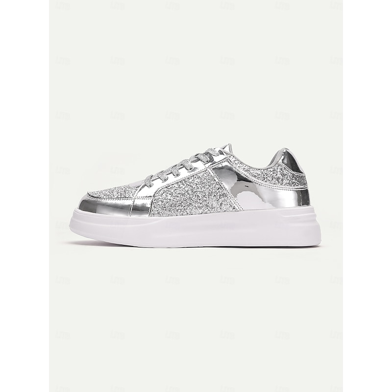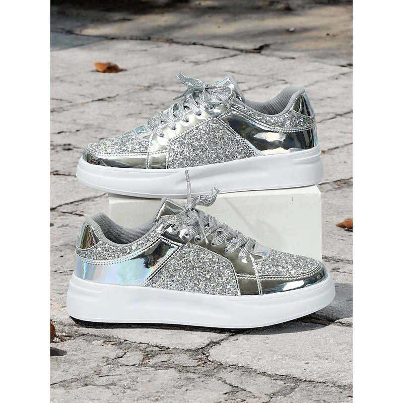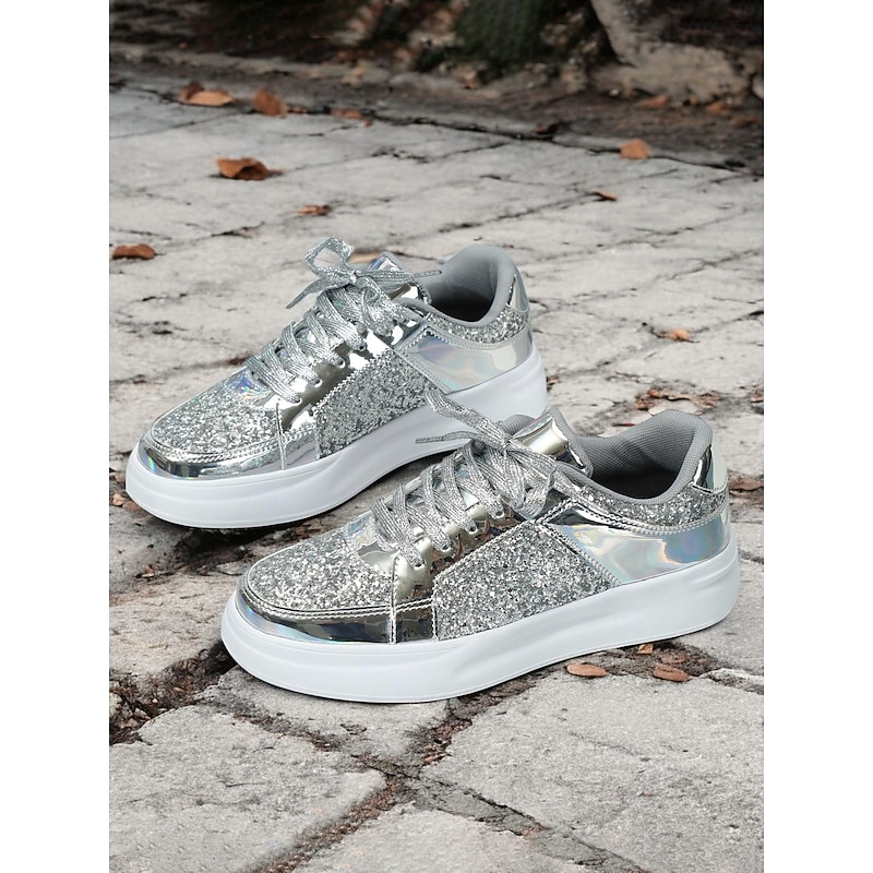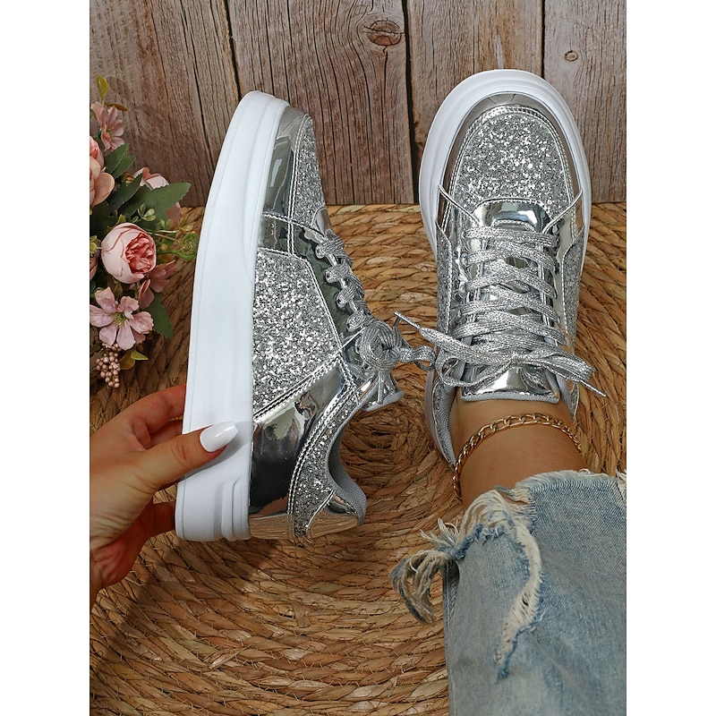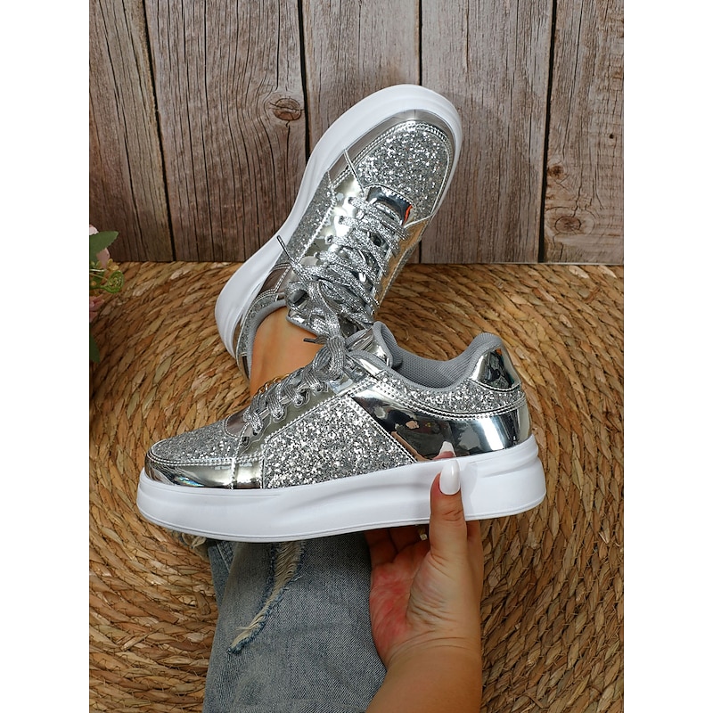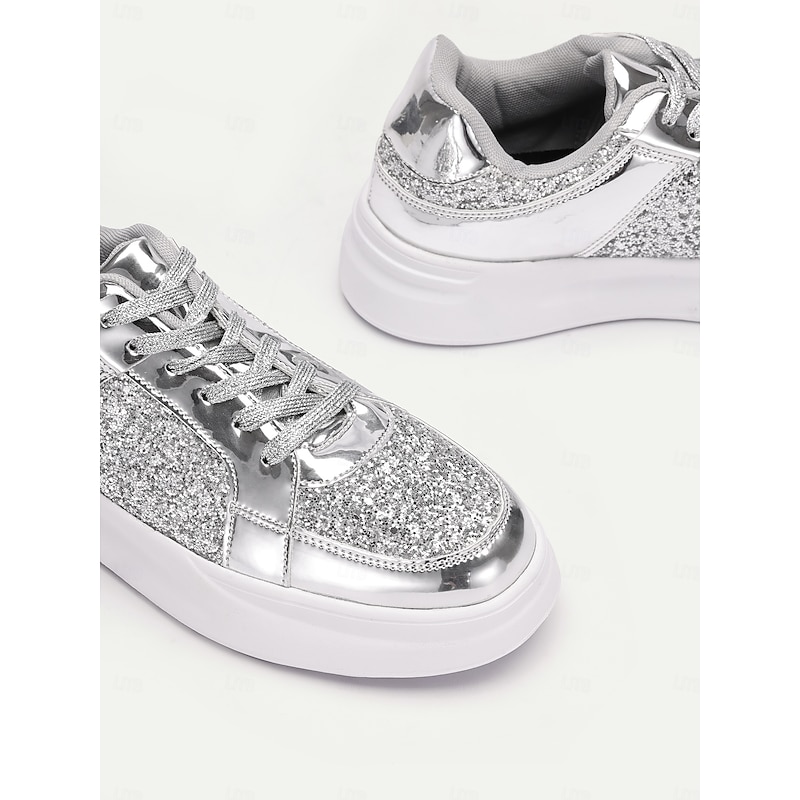 Women's Silver Glitter and Metallic Sneakers – Trendy Lace-Up Shoes for Parties and Casual Wear 23