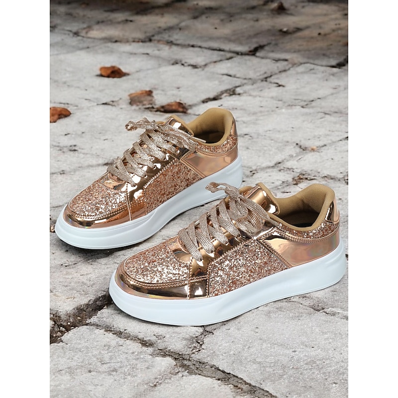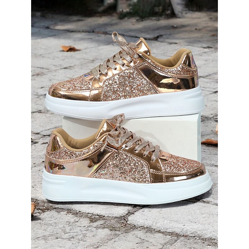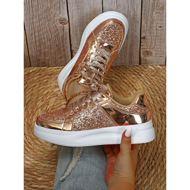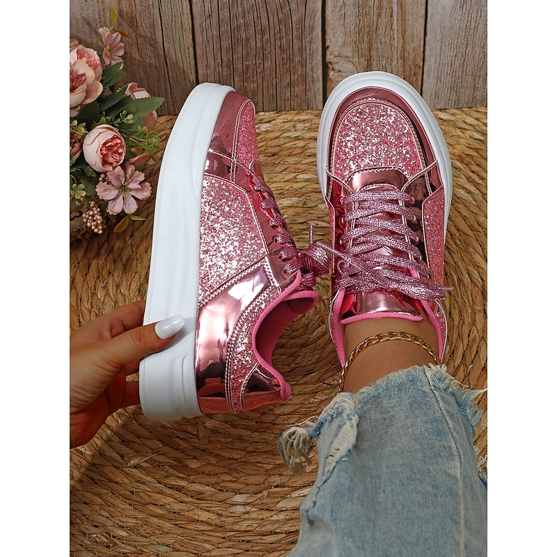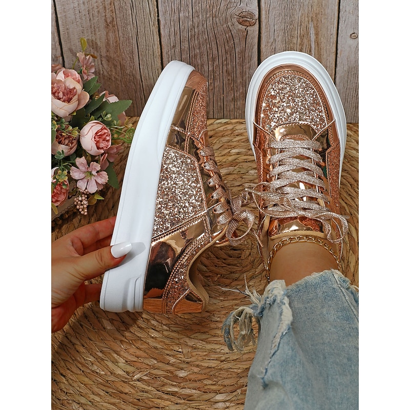 Highlights [Fabric] : Crafted from a blend of faux leather and sequined embellishments, these sneakers deliver an eye-catching aesthetic with a touch of sparkle. The glossy metallic accents and glitter fabric create a vibrant style that elevates any casual or party outfit. [Fit] : Featuring a low-top silhouette, these lace-up sneakers offer a comfortable and relaxed fit that is perfect for both everyday wear and special occasions where you want to make a fashion statement. [Design Highlights] : The shimmering thread laces add a layer of glam, while the pointed toe and minimalist design contribute to a sleek and modern look. The durable rubber sole provides excellent grip and flexibility, ensuring both style and functionality. [Occasions] : Ideal for a variety of settings, these sneakers are perfect for daily wear, travel, or special occasions like Mother’s Day. Whether paired with jeans or a playful dress, they add a touch of glamour to your outfit. [Size Range] : Available in a wide range of sizes, from US5.5 / EU35 / UK3.5 to US10.5 / EU42 / UK8.5, these sneakers are designed to cater to different preferences, ensuring the perfect fit for a variety of foot sizes.
