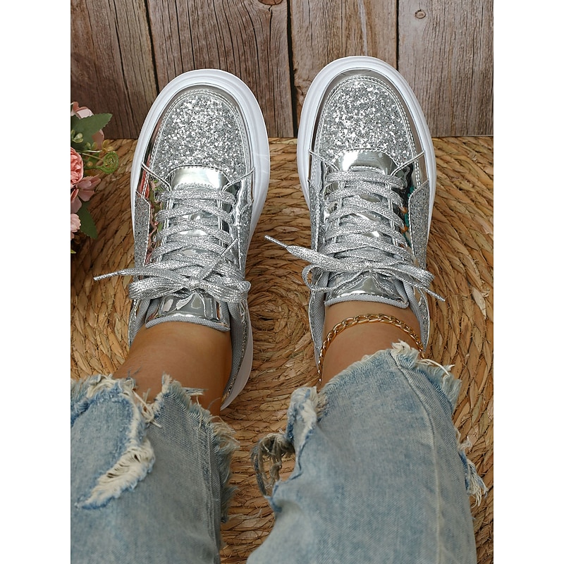 HOT ! Women's Silver Glitter and Metallic Sneakers – Trendy Lace-Up Shoes for Parties and Casual Wear