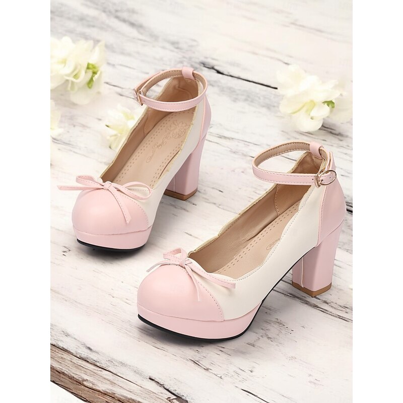 Highlights [Fabric] : Crafted from high-quality PU leather, these women's heels offer a durable and smooth finish, providing a sophisticated base for the elegant two-tone design. [Fit] : Featuring a supportive block heel, these shoes are designed to provide stability and comfort for all-day wear. The padded inner sole enhances comfort, making them suitable for various occasions. [Design Highlights] : These vintage-style shoes showcase a delicate two-tone design in pink and ivory, complemented by a rounded toe and a charming bow detail. The adjustable ankle strap with a buckle ensures a secure and personalized fit, while the cone heel and platform add a playful yet elegant flair. [Occasions] : Perfect for both daily wear and special occasions, these shoes can easily transition from a casual day out to a sophisticated evening event. Pair them with a casual dress or a smart outfit to add a touch of vintage elegance to any ensemble. [Size Notice] : Available in sizes ranging from US5.5 to US10.5, these shoes are designed for a standard fit; select your usual size for the best comfort and style.