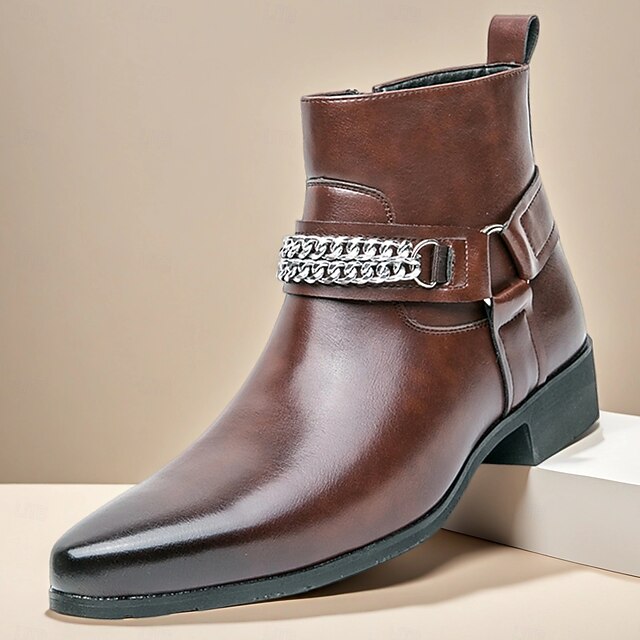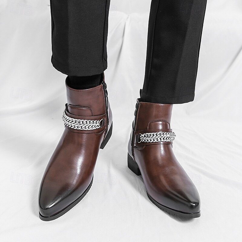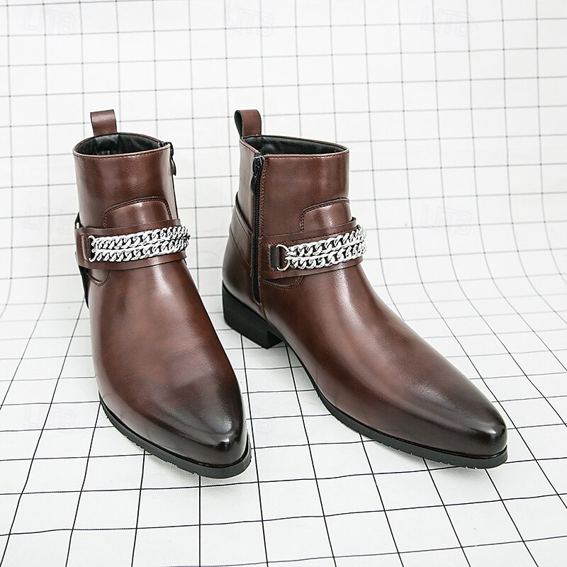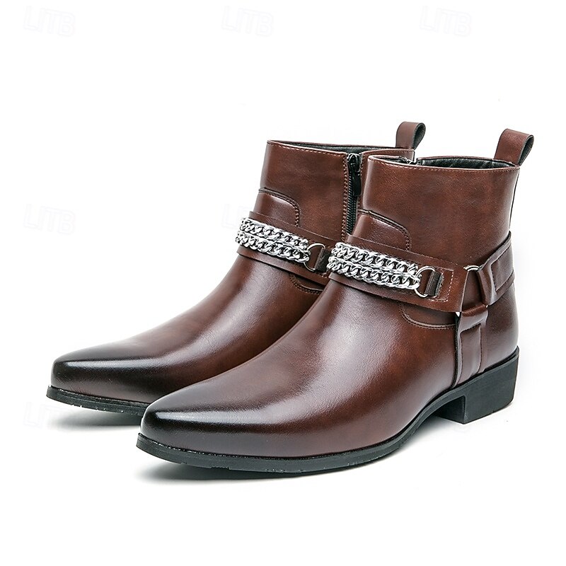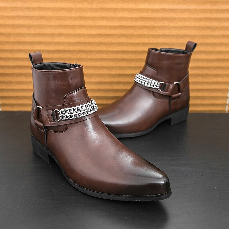 HOT ! Men's Brown Faux Leather Chelsea Boots with Chain Accent, Sleek and Modern Look for Formal Office Attire, Parties and Evenings Out