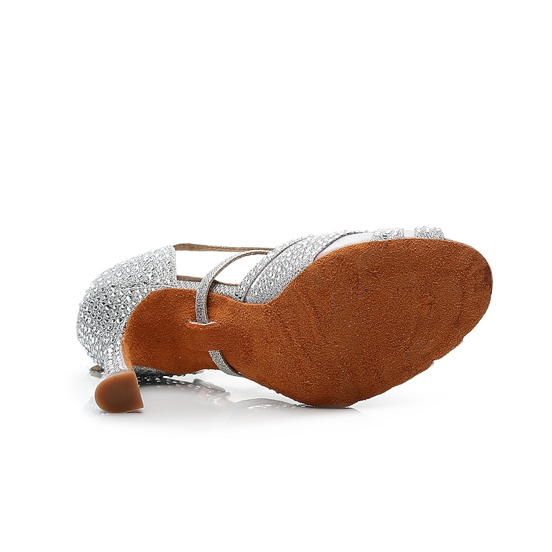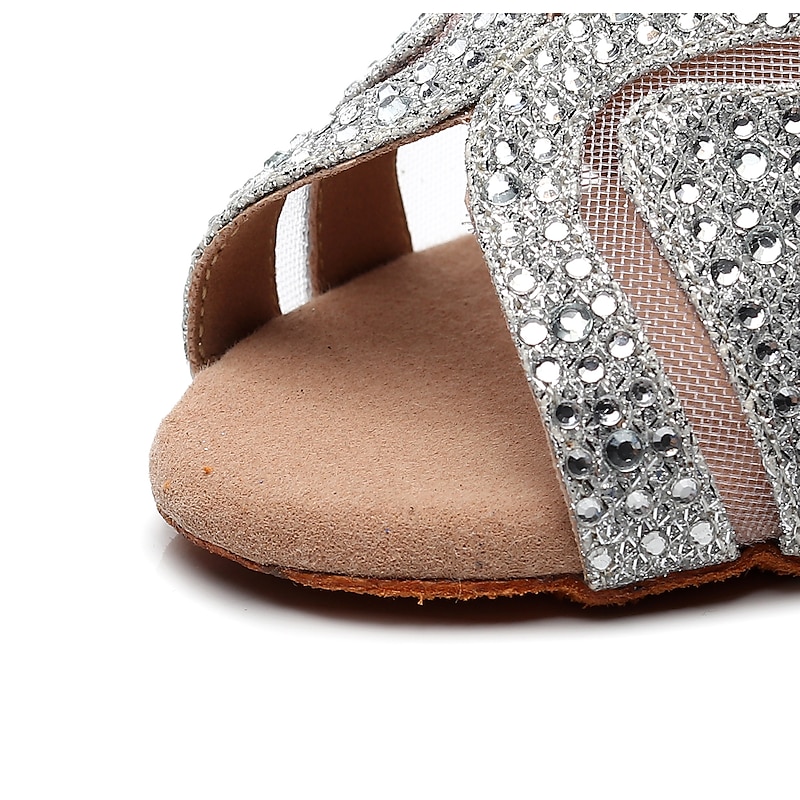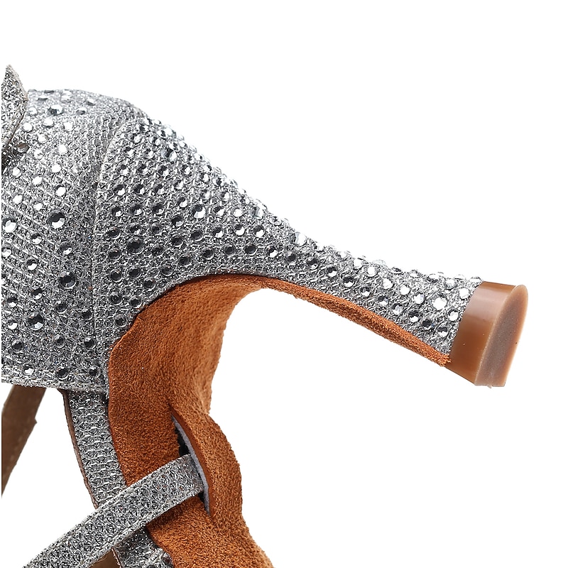 Women's Silver Rhinestone Dance Shoes with Crisscross Straps - Open-Toe Ballroom and Latin Heels