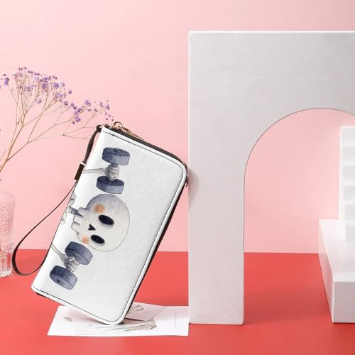 Cute Skeleton Lifting Dumbbells Gym PU Leather Clutch Long Bifold Wallet, Coin Purse Credit Pass Case, Durable Card-Holder Money Storage for Women Men 1