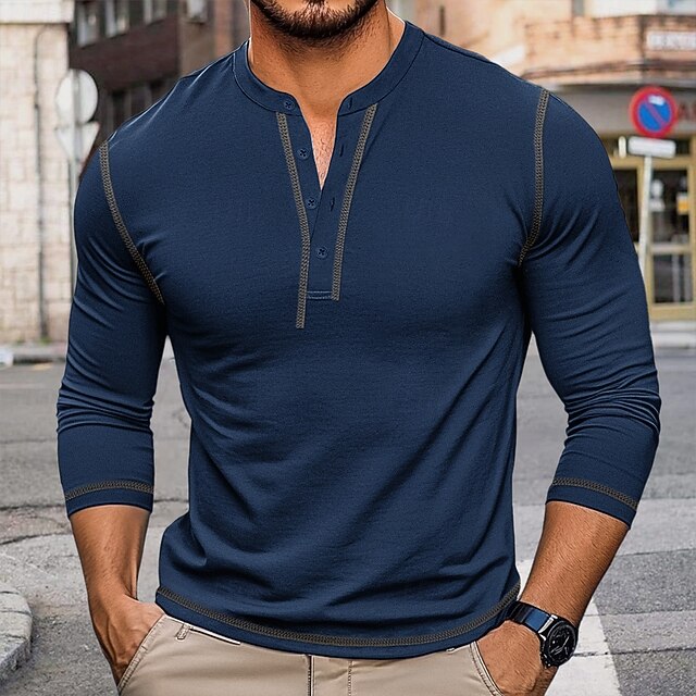 Highlights [Fabric:] Crafted from 100% cotton, this men's Henley shirt ensures maximum comfort and breathability, making it an ideal choice for everyday wear. The micro-elasticity of the fabric allows for natural movement while maintaining a polished look. [Fit:] With its long sleeves and enduring Henley neckline, the shirt offers a relaxed yet refined fit, suitable for layering or wearing on its own. The fitted silhouette enhances the wearer’s form, creating a flattering appearance. [Design Highlights:] The shirt features a timeless Henley neckline with a round collar and a three-button placket, adding a touch of sophistication to its casual style. The color block pattern brings a current flair, while detailed stitching along the shoulders and arms provides both visual interest and added durability. [Occasions:] Perfect for street, casual, outdoor activities, and home wear, this shirt is versatile enough for a variety of settings. Whether it's a laid-back weekend outing or a leisurely day at home, this Henley tee complements any casual ensemble effortlessly. [Size Range:] Available in a wide range of sizes, from S to XXL, this shirt caters to different body types, ensuring a comfortable and tailored fit for all.
