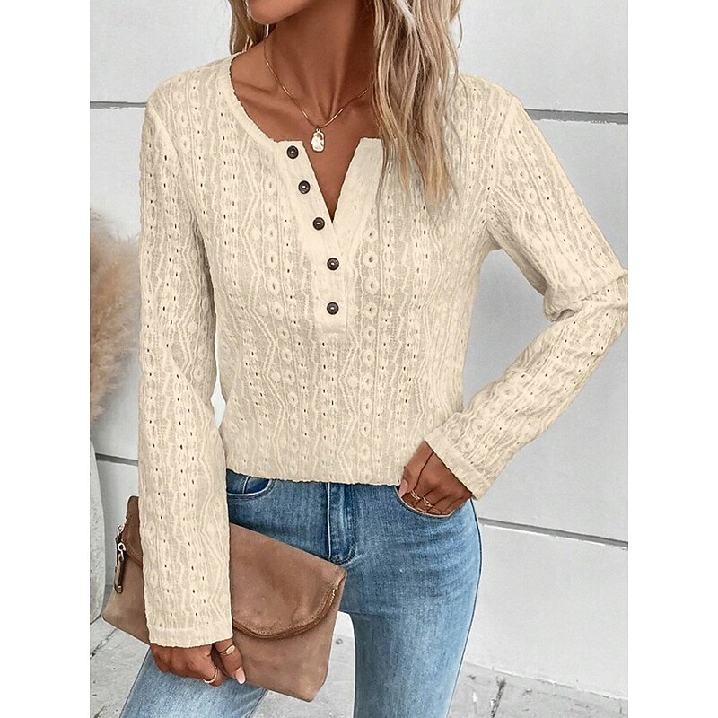 Highlights [Fabric] : Crafted from a lightweight polyester blend, this tunic blouse offers a micro-elastic fit for added comfort. The fabric features elegant lace elements and intricate eyelet details, giving it a delicate and airy feel, perfect for breathing through spring and fall. [Fit and Style] : Designed in a casual yet elegant style, the tunic has a loose fit, making it suitable for various body types. The relaxed silhouette ensures it complements your everyday wardrobe effortlessly. [Design Highlights] : This blouse boasts a notched neck with button details for adjustable styling. The long sleeves are fitted at the cuffs for a tailored appearance, while the solid color design in black, white, or beige adds a timeless touch. [Occasions] : Versatile for daily wear, this blouse is perfect for casual outings and even semi-formal gatherings. Pair it with jeans or skirts for a fresh, classic look suitable for any occasion. [Size Range] : Available in sizes S, M, L, XL, and 2XL, this blouse offers a range of fits to cater to your style preferences and needs.