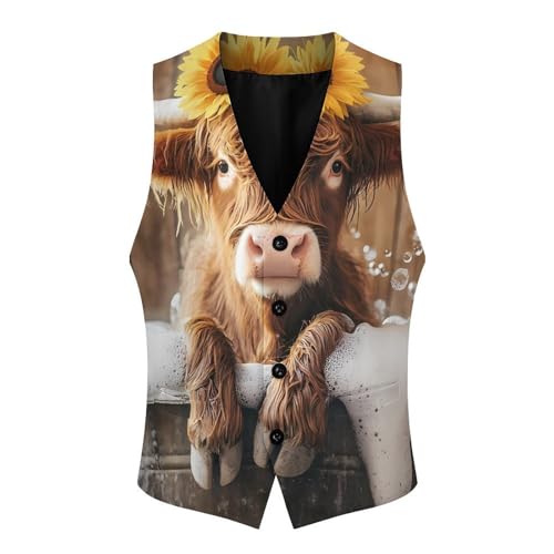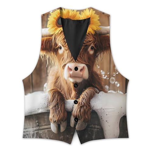 HOT ! Cute Highland Cow Bath Suit Vest for Men Slim Fit Sleeveless Jacket V Neck Business Waistcoat Button Up Dressy Top