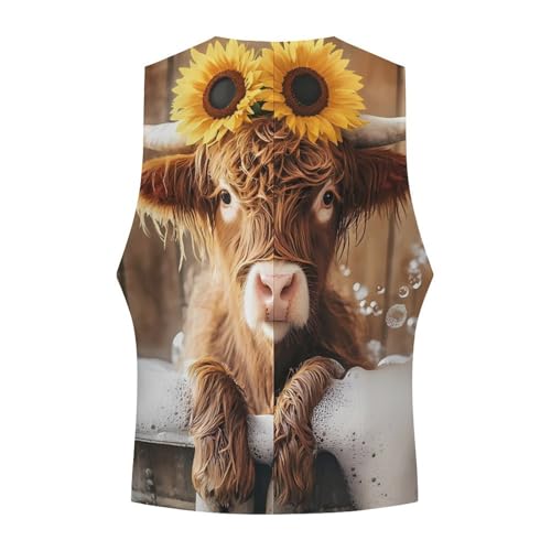 Cute Highland Cow Bath Suit Vest for Men Slim Fit Sleeveless Jacket V Neck Business Waistcoat Button Up Dressy Top 1