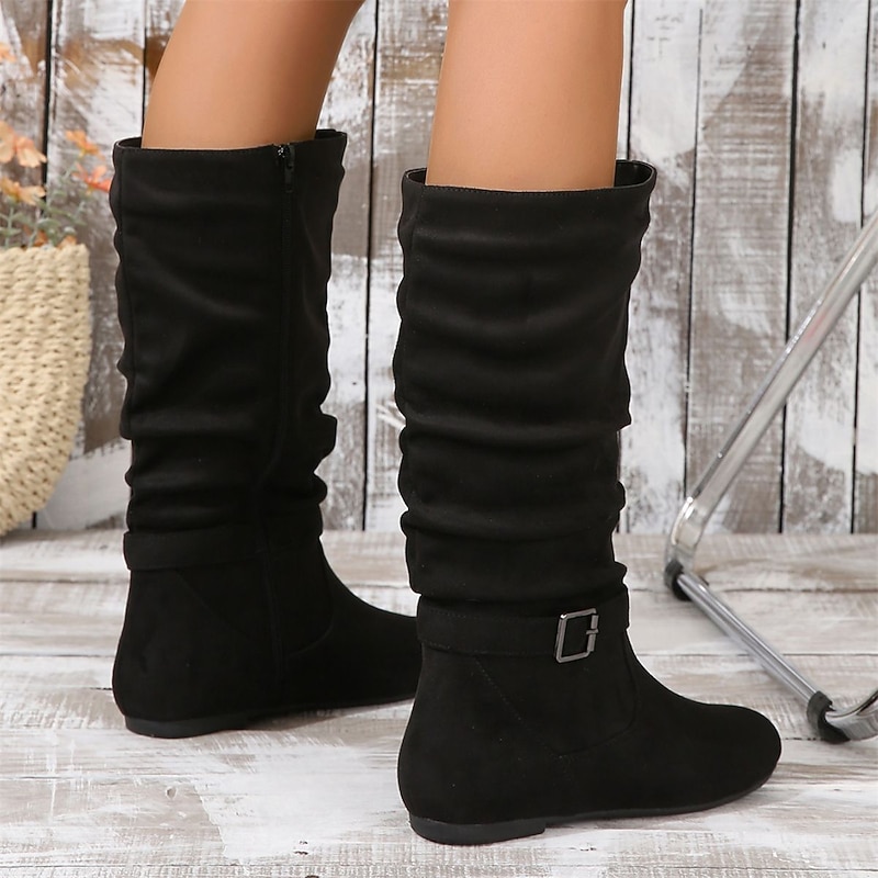 Highlights [Fabric] Crafted from premium faux suede and lined with faux fur, these boots offer both aesthetic appeal and cozy comfort. The materials ensure warmth and durability for fall and winter wear. [Silhouette] Featuring a slouchy, mid-calf silhouette, these boots offer a relaxed fit that is effortlessly stylish and versatile. The flat sole and low heel provide stable support, making them perfect for all-day wear. [Design Highlights] These boots are designed with a convenient side zipper and an adjustable buckle strap, adding a touch of classic elegance and offering a customizable fit. The round toe shape complements the overall comfortable and minimalistic style, while subtle embroidery adds a unique charm. [Occasions] Ideal for daily casual outings or more dressed-up outdoor events during the colder seasons. These boots are a versatile addition to any wardrobe, effortlessly pairing with jeans, skirts, or dresses for a chic, timeless look. [Size Range] Available in a comprehensive size range to suit various preferences, including US sizes 6 to 10.5, ensuring a fit for every style lover.