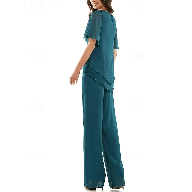 Two Piece Pantsuit Mother of the Bride Dress Elegant Crew Neck Floor Length Chiffon Short Sleeve with Lace Embroidery Cascading Ruffles 3