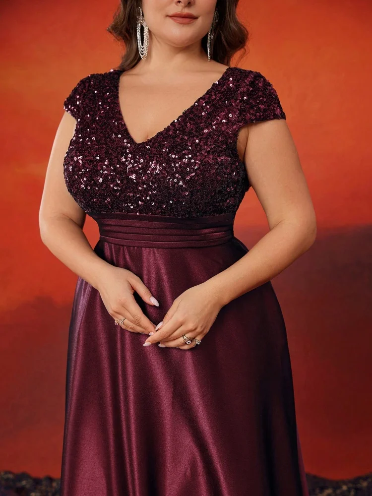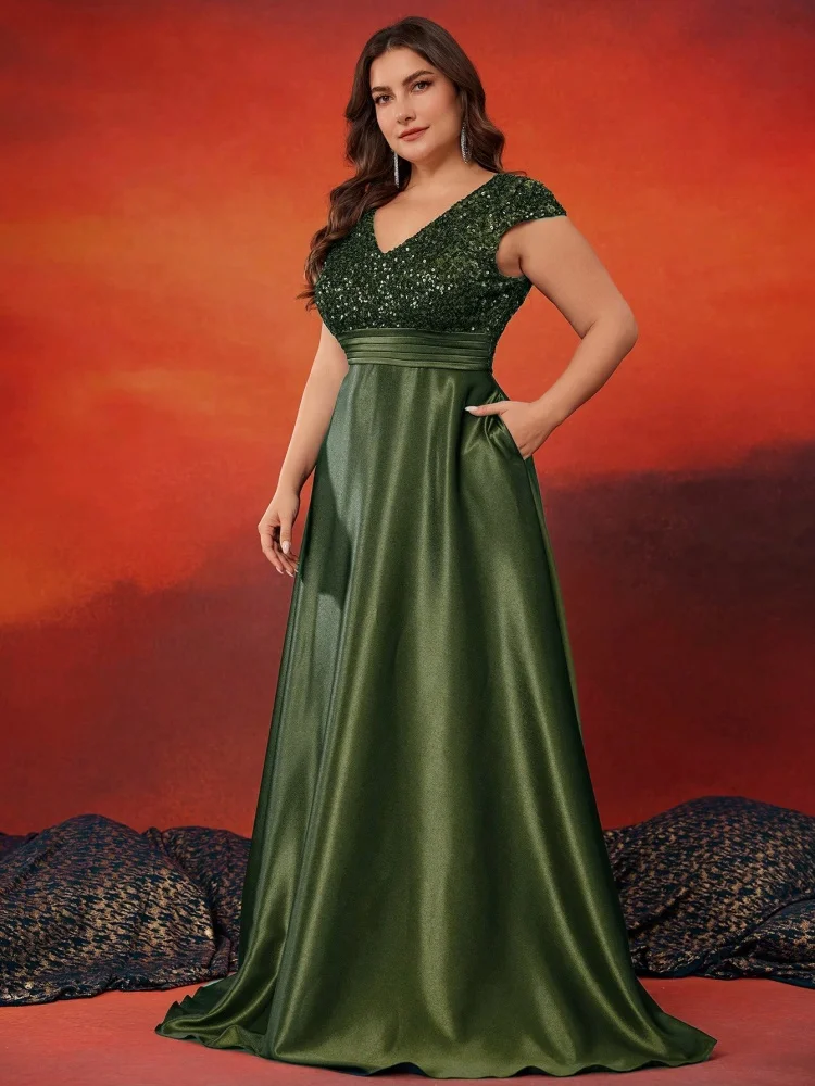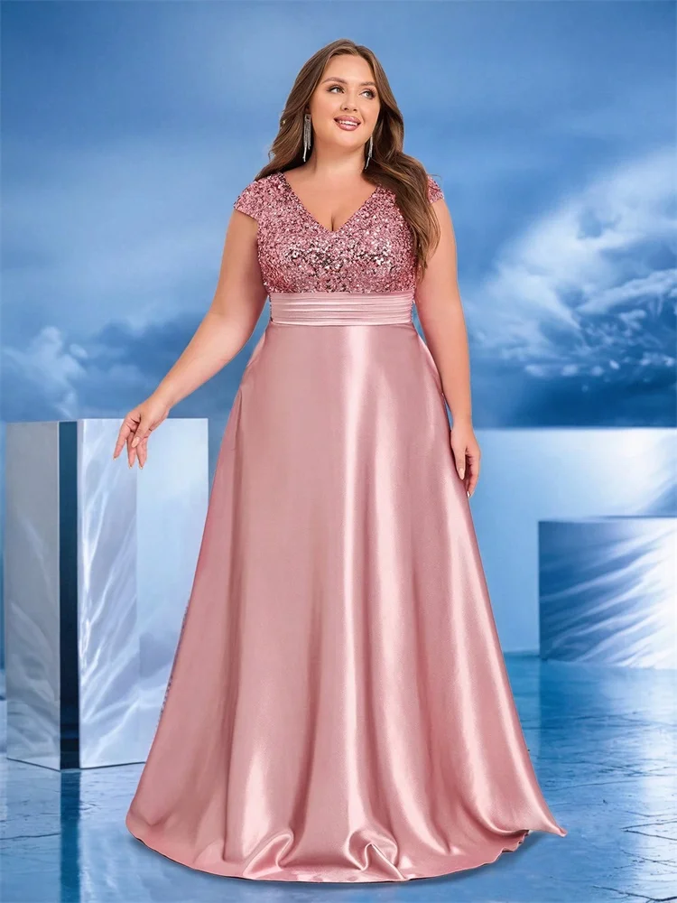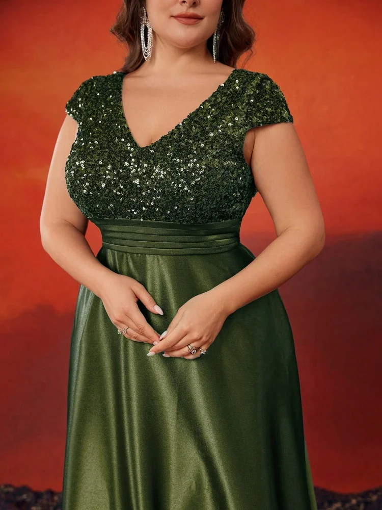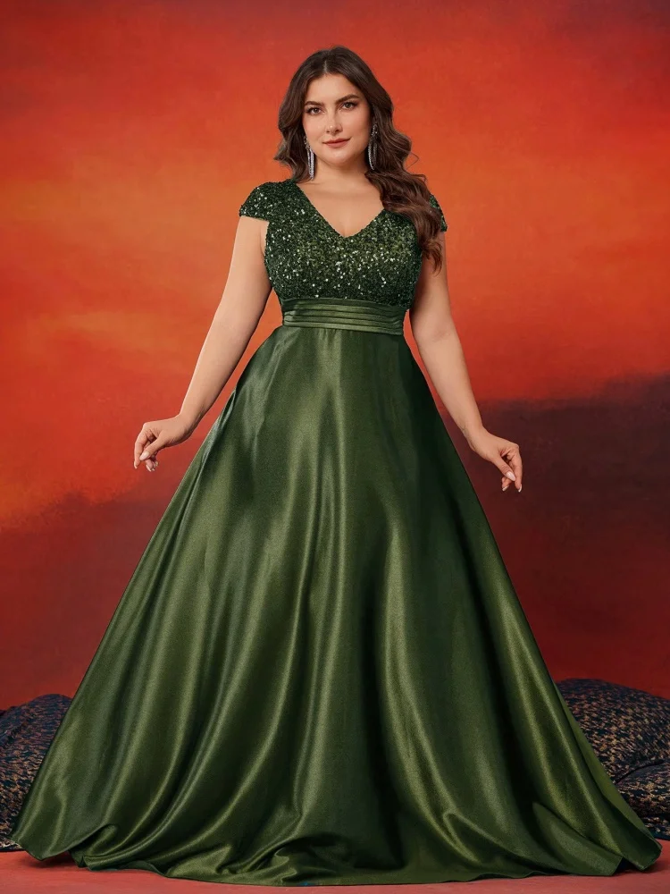 Plus Size Elegant V-Neck Sequin Evening Dress Long Luxury Satin Short Sleeves Party, Prom, Cocktail Dress