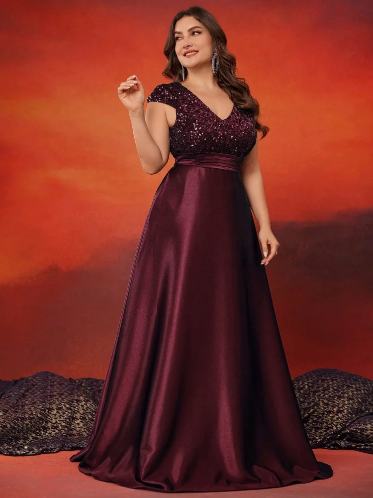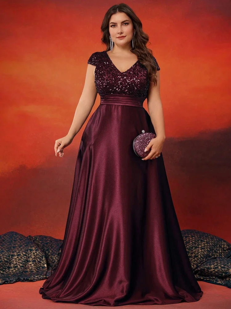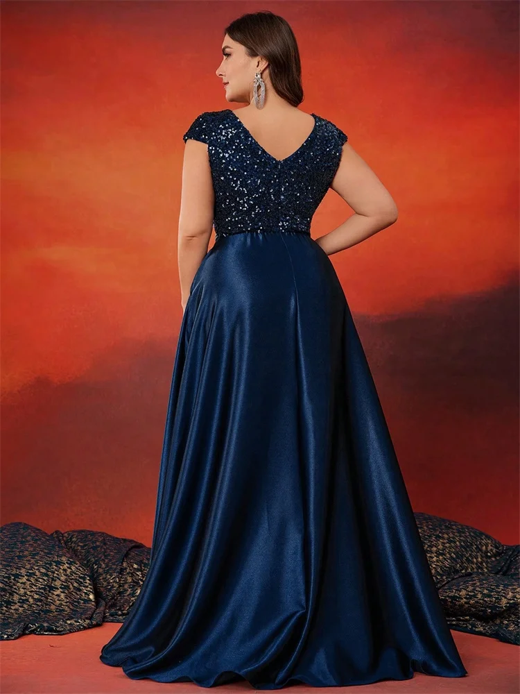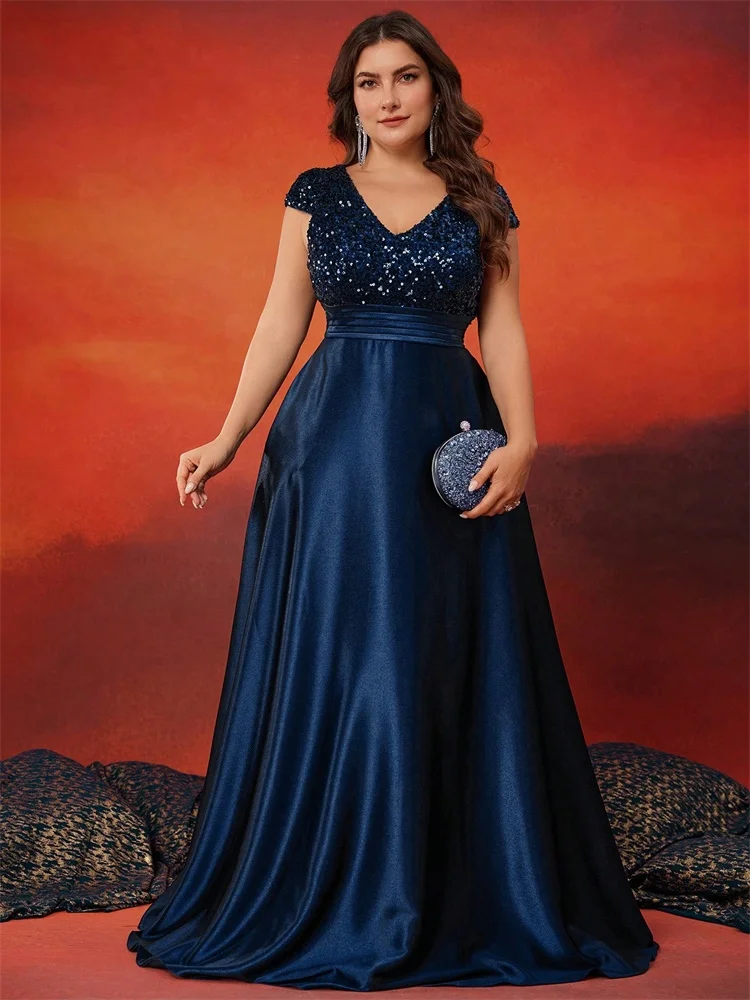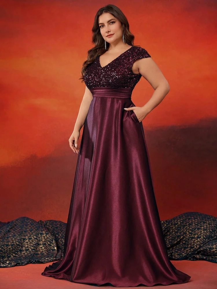Plus Size Elegant V-Neck Sequin Evening Dress Long Luxury Satin Short Sleeves Party, Prom, Cocktail Dress