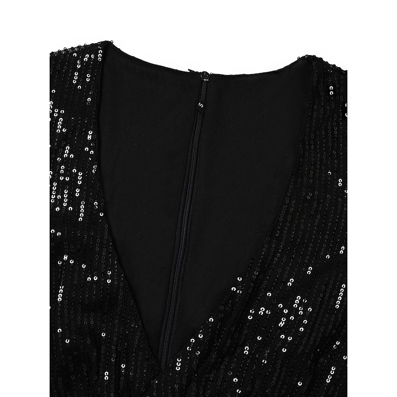 **[Design Highlights]**: Featuring a standout ruched detailing and gleaming sequins, this dress offers a touch of glam suitable for evening events. The wrap V-neck gives it a modern twist, adding to its captivating aesthetic.