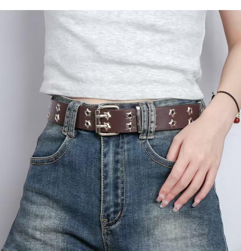 Star Studded Faux Leather Belt, Double Prong Buckle, Black 4