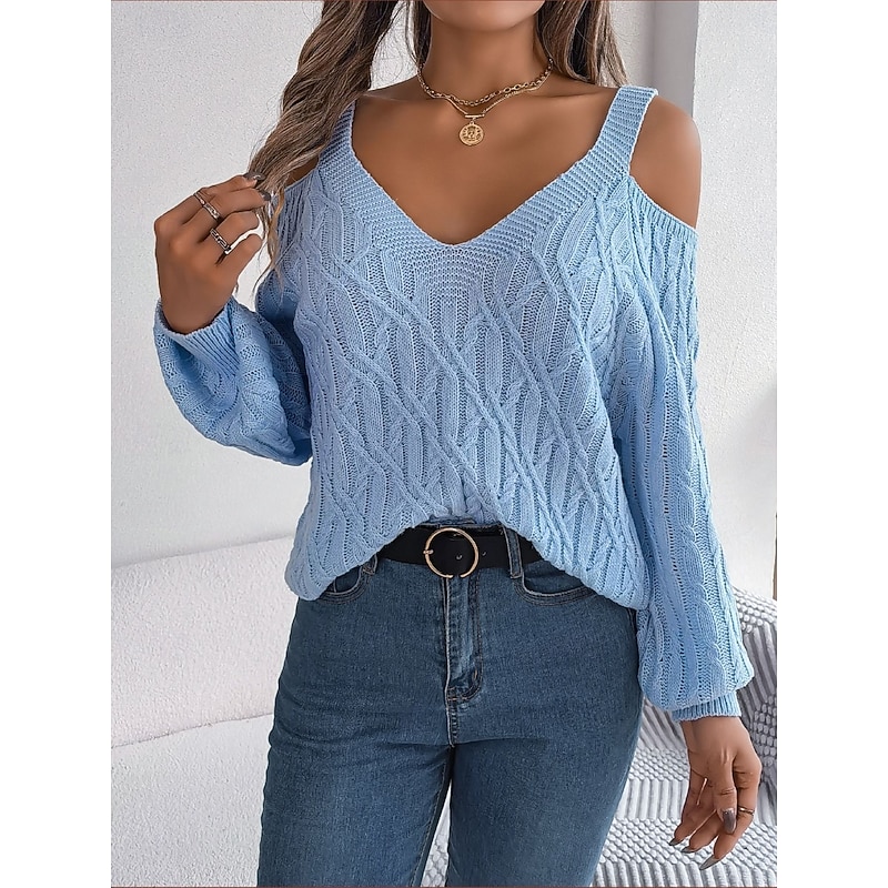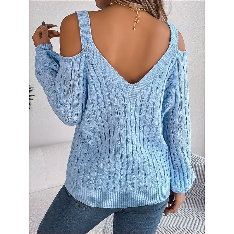 HOT ! Women's Sweater Casual Soft Pure Color Ribbed Strap Knitted Cold Shoulder Long Sleeve Regular Tops Knit Outdoor Daily Weekend White Khaki Fall Winter