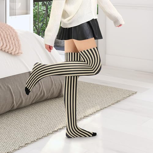 HOT ! Beige Black Stripes Thigh High Socks, Women's Knee High Socks - Extra Long High Socks