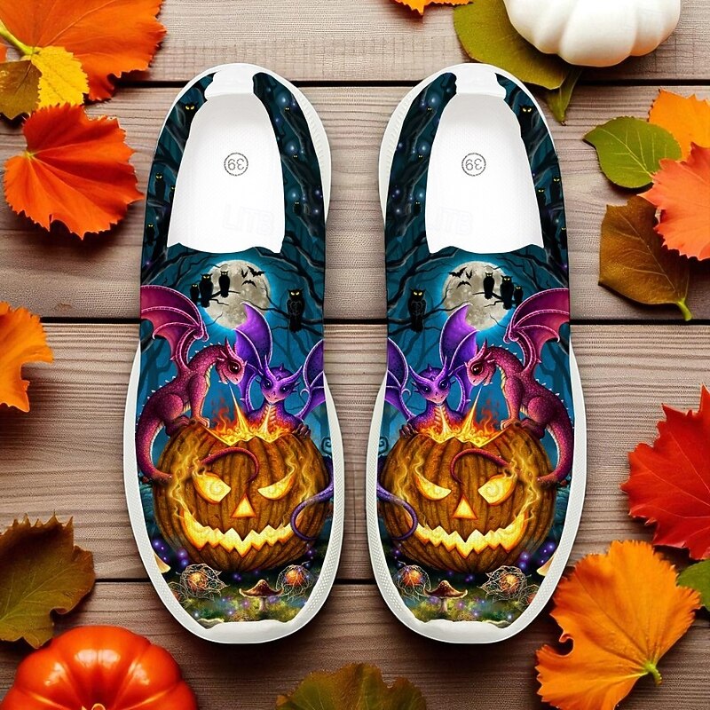 Women's Halloween Pumpkin Slip-On Shoes – Blue Flyknit Walking Sneakers with Jack-O'-Lantern Design for Spooky Nights, Haunted Events and Themed Fall Outings Sarah Richter 7