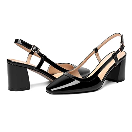 AMBELIGHT Womens Wedding Solid Slingback Square Toe Patent Dress Buckle Chunky Mid Heel Pumps Shoes 2.5 Inch 5