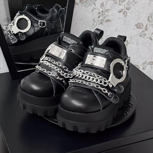 • Goth Boots design: the matte leather upper is embellished with metal chains and handcuff shaped decorations for a rock and roll style that will make you the latest Y2K girl. Overall widened metal plaque, customized black and grey fabric label, the details are done in a heavy duty, sneaker-like fit design