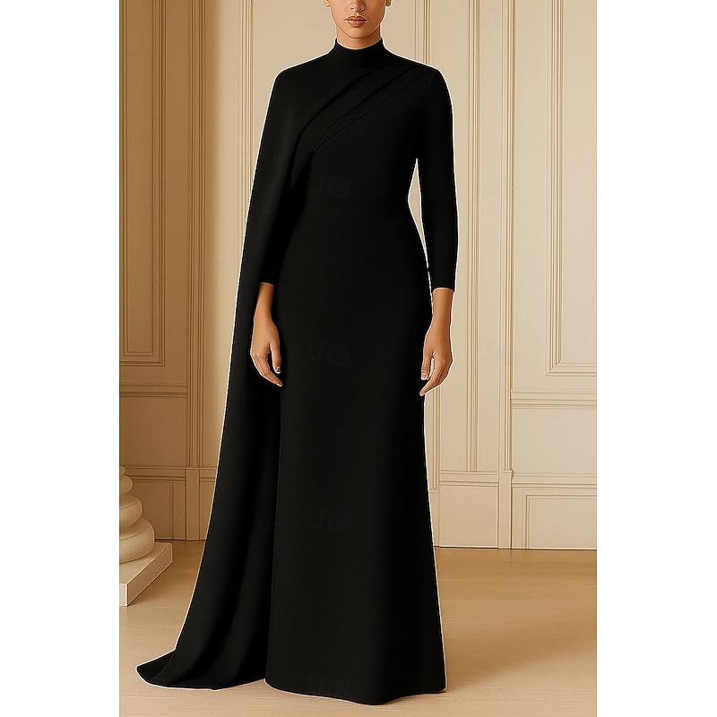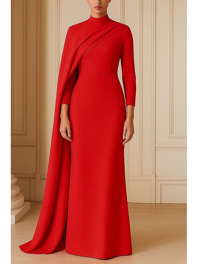 HOT ! Formal Cape Dress Sheath / Column Evening Gown Detachable Cape Elegant Dress Formal Wedding Sweep / Brush Train 3/4 Length Sleeve High Neck Stretch Crepe with Ruched 2025
