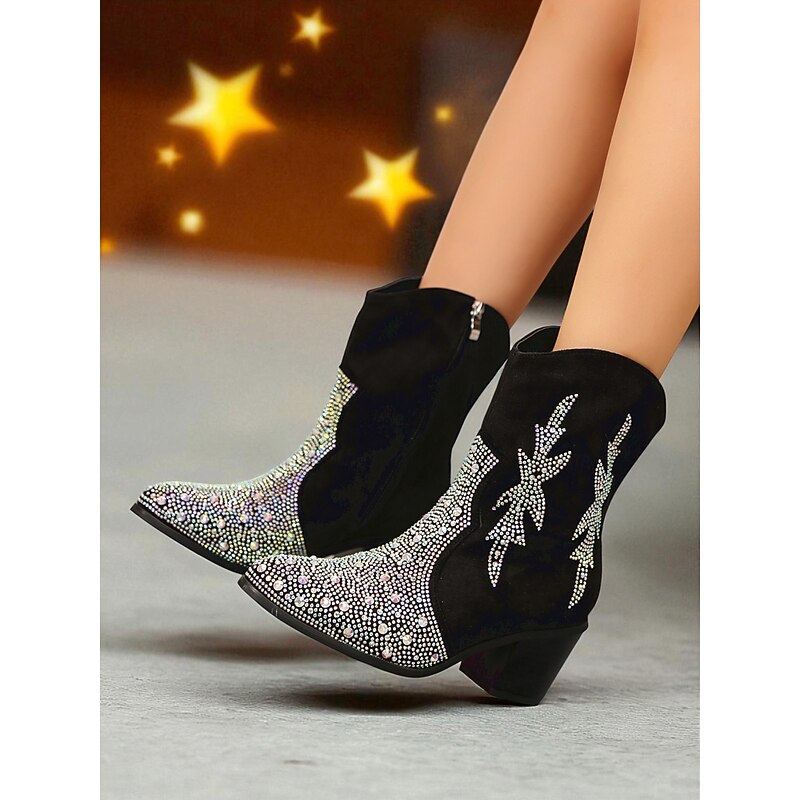Women's Rhinestone Western Ankle Boots - Sparkly Cowboy Style Mid Heel Short Boots for Nightlife Party and Club Outfits 1