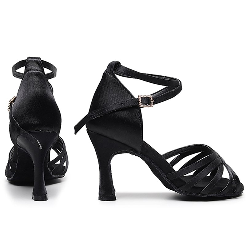 Women's Satin Latin Dance Shoes with Strappy Design, Rhinestone Buckle and Soft Suede Sole - Ideal for Ballroom and Salsa Performances