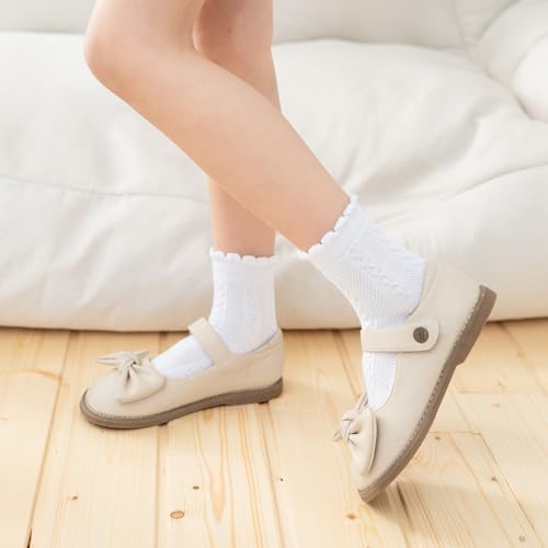 • Soft Cotton Comfort‌ - Crafted with 77% cotton for breathability, 20% polyester for durability, and 3% spandex for stretch.The ribbed cable knit and mesh construction ensure all-day comfort while delicate ruffle cuffs add a charming touch. Ideal for active toddlers to school-age kids.