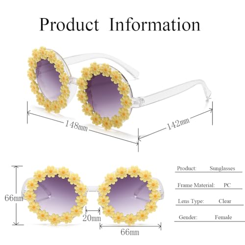 • CUTE APPEARANCE– Cute and fashionable flower sunglasses with a circle of cute flowers on the outside look even more sunshine cute. There are several colors available: White, Pink, Purple, Yellow.