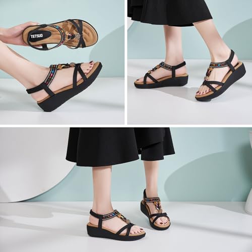 sizzling ! TETSUO Sandals Women Platform Wedge Low Heels Sandals Dressy Flower Summer Beach Rhinestone Casual Shoes for Women Walking Elastic Ankle Strap Open Toe Bohemia Shoes