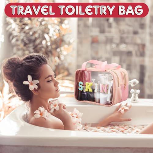 Geetery Chenille Letter Patch Makeup Bag with Handy Handle - Preppy Nylon Cosmetic Organizer with Zipper, Large Travel Toiletry Storage Bag for Women Portable Pink Makeup Case, Women Gifts 6