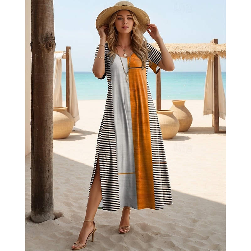 More information about Women's Maxi Dress T Shirt Dress Tee Dress Sundress Shift Dress Vacation Casual Beach Party Beach Regular Fit Geometric Stripe Short Sleeve Crewneck Yellow Pink Red Blue Summer Spring