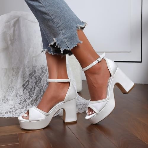 Platform Heels Wedding Shoes for Bride Block Heel Wedding Sandals Open Toe Bridal Shoes 6