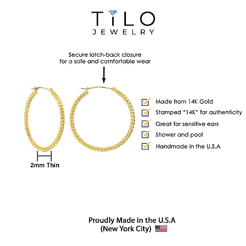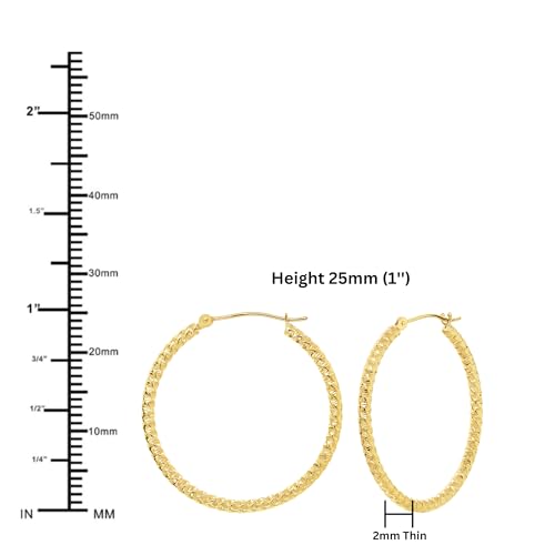 Item width: 2 millimetersMaterial: Yellow GoldMetal type: Yellow GoldBack Finding: Hinged HoopEarring design: HoopGem type: No GemstoneCrafted from 14K Yellow Gold, these hoop earrings are stamped “14K” for authenticityHoops Diameter: 25mm (1 inch) -- Tube Thickness: 2mmThese gorgeous Spiral Textured Hoops will take your look to the next level. These Hoops Earrings are ideal for everyday wear, for work or dine out. Perfect Birthday, Christmas, Anniversary, Valentine’s Day, Mother’s Day gift. And a must-have hoops that every woman will love.Easy to put on, secure and plush to wear -- Shipped in an Elegant Gift Box!To Ensure Your Complete Satisfaction, We Offer a 60 Day No-Questions-Asked Money Back Guarantee. Perfect for everyday use. premium materials and excellent craftsmanship ensure long-lasting durability.