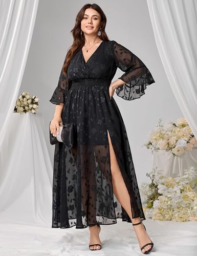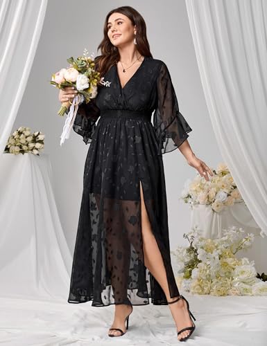 More information about Wedding Guest Dress Plus Size Ruffle Bell Sleeve V Neck A Line Flowy Empire Waist Maxi Dresses with Slit
