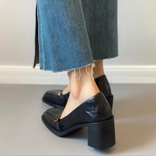 Women's Leather Block Heel Mary Janes Classic Square Toe Buckle Mid Block Heel Pumps for Wedding Party Dress Shoes 6