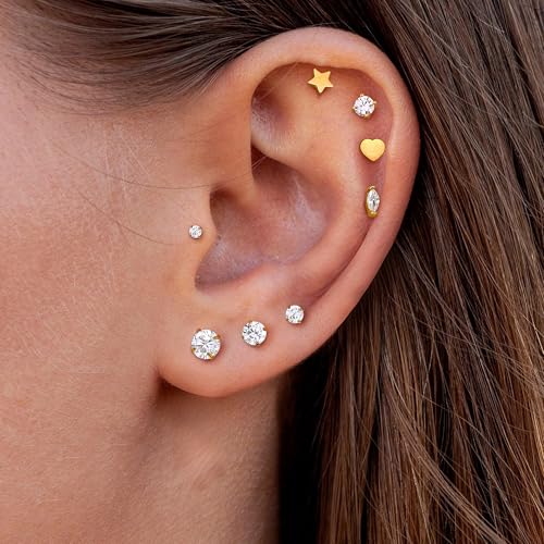 • Details of Dainty Flat Back Earrings Studs Set : These small flat back stud earrings are made of 316L stainless steel, AAAAA+ CZ and 14k gold filled, includes 4 pcs posts (bar Length: 6mm), 4 pcs different size of thread top(top size: 2mm 3mm 4mm 5mm), 1 pc piercing taper insertion pin, and post thickness: 18G (1.0mm)