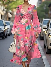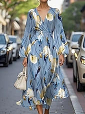 More information about Women's Midi Dress Casual Dress Print Dress Elegant Fashion Outdoor Party Holiday Regular Fit Flower Long Sleeve V Neck Pink Blue Green Summer Spring