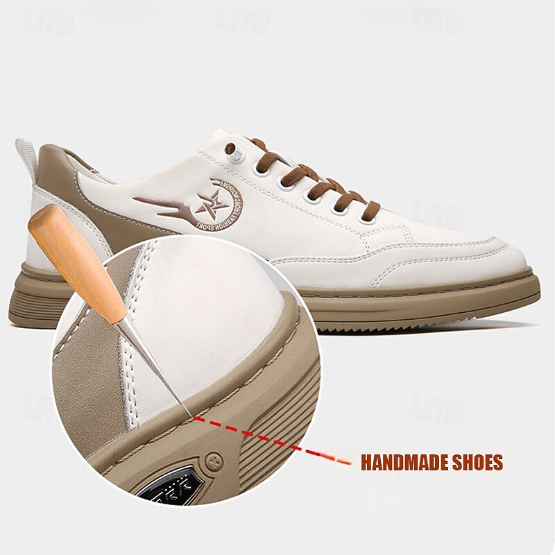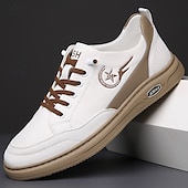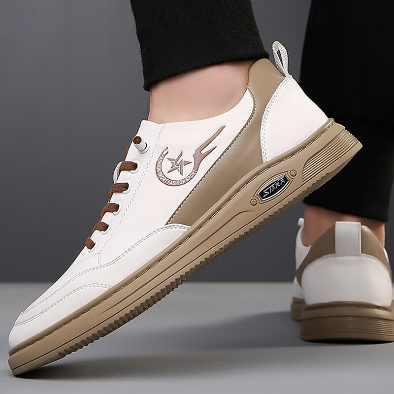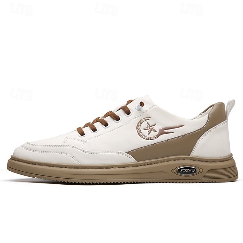 Highlights [Fabric] : Crafted from high-quality PU Leather, these Men's Sneakers deliver a sleek and contemporary look with a sturdy and easy-to-clean surface. The PU lining ensures a comfortable fit, making them perfect for everyday use. [Style] : Featuring a modern, round-toe design, these sneakers seamlessly combine casual and sporty elements, making them ideal for a versatile wardrobe. The predominantly white color is accentuated by taupe details for a sophisticated edge. [Design Highlights] : With a lace-up closure and contrasting brown laces, these sneakers ensure a secure and adjustable fit while adding a pop of color. The sporty emblem on the side enhances the fashionable yet athletic aesthetic. The robust rubber outsole provides excellent grip and slip resistance, complemented by a cushioned insole for all-day comfort. [Occasions] : These sneakers are perfect for a range of activities, from casual daily wear to light athletic pursuits. Whether you're dressing for a laid-back weekend outing or running errands, these shoes offer a blend of style, comfort, and practicality. [Size Range] : Available in various sizes including US6 to US10, these sneakers cater to a wide range of foot sizes. The design ensures a comfortable fit for all-day wear, making them a staple addition to any wardrobe.