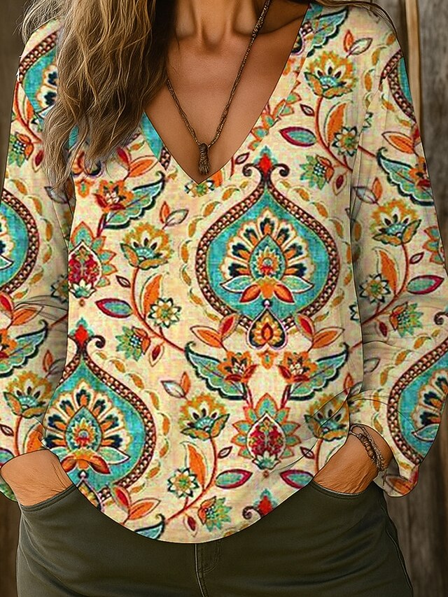 HOT ! Women's T Shirt Floral Casual Long Sleeve V Neck Regular Tops Going out Weekend Print White Navy Blue Blue Green Khaki Fall
